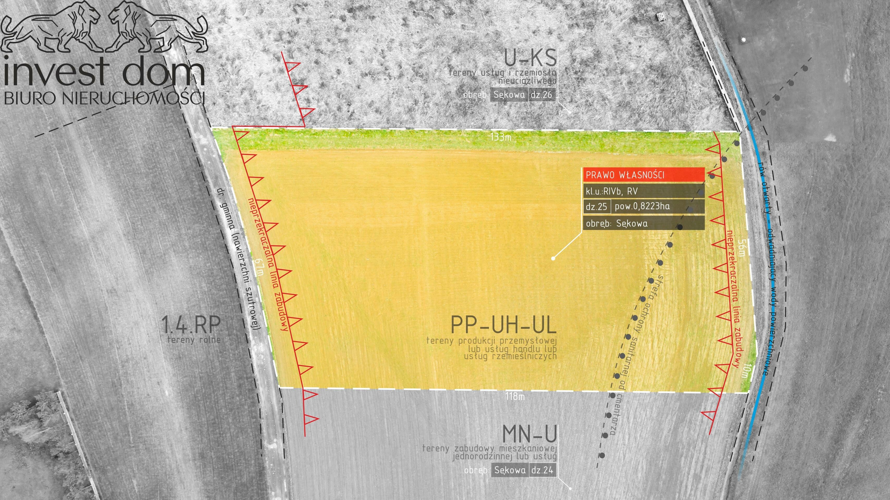 Przedmiotem sprzedaży jest całe prawo własności do nieruchomość gruntowej niezabudowanej, oznaczonej jako działka ewidencyjna numer: 25 o powierzchni łącznej: 0,8223 ha, które zgodnie z (MPZP) Miejscowym Planem Zagospodarowania Przestrzennego stanowi obszar znajdujący się w terenach oznaczonym symbolem: PP-UH-UL - (tereny produkcji przemysłowej lub usług handlu lub usług rzemieślniczych) co pozwala w pełni na optymalne i korzystne zagospodarowanie gruntu, stanowiąc w całości klaso-użytek: (RIVb, RV) zlokalizowana w pobliżu drogi powiatowej w miejscowości Sękowa, gm. Sękowa, woj. małopolska.