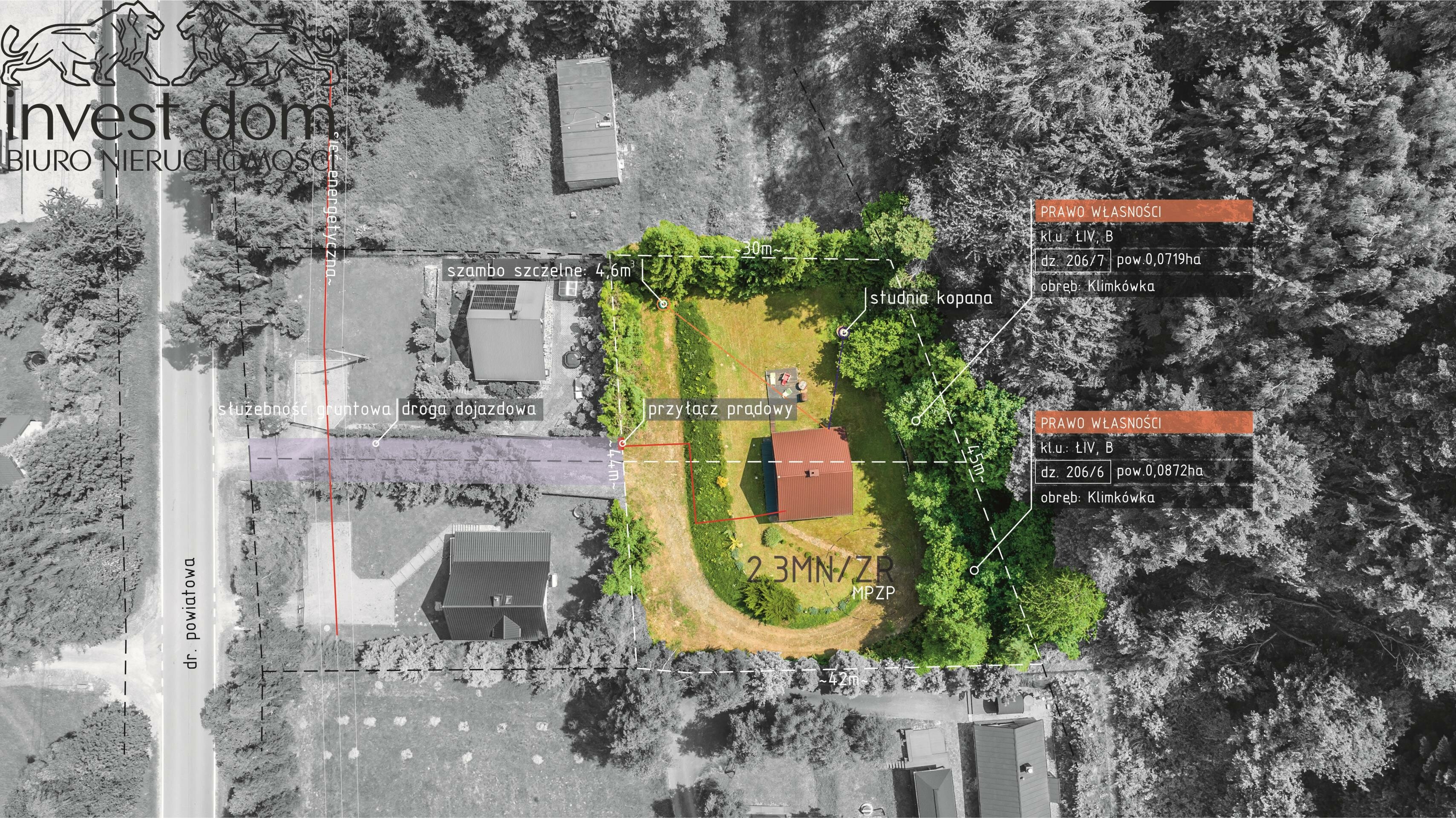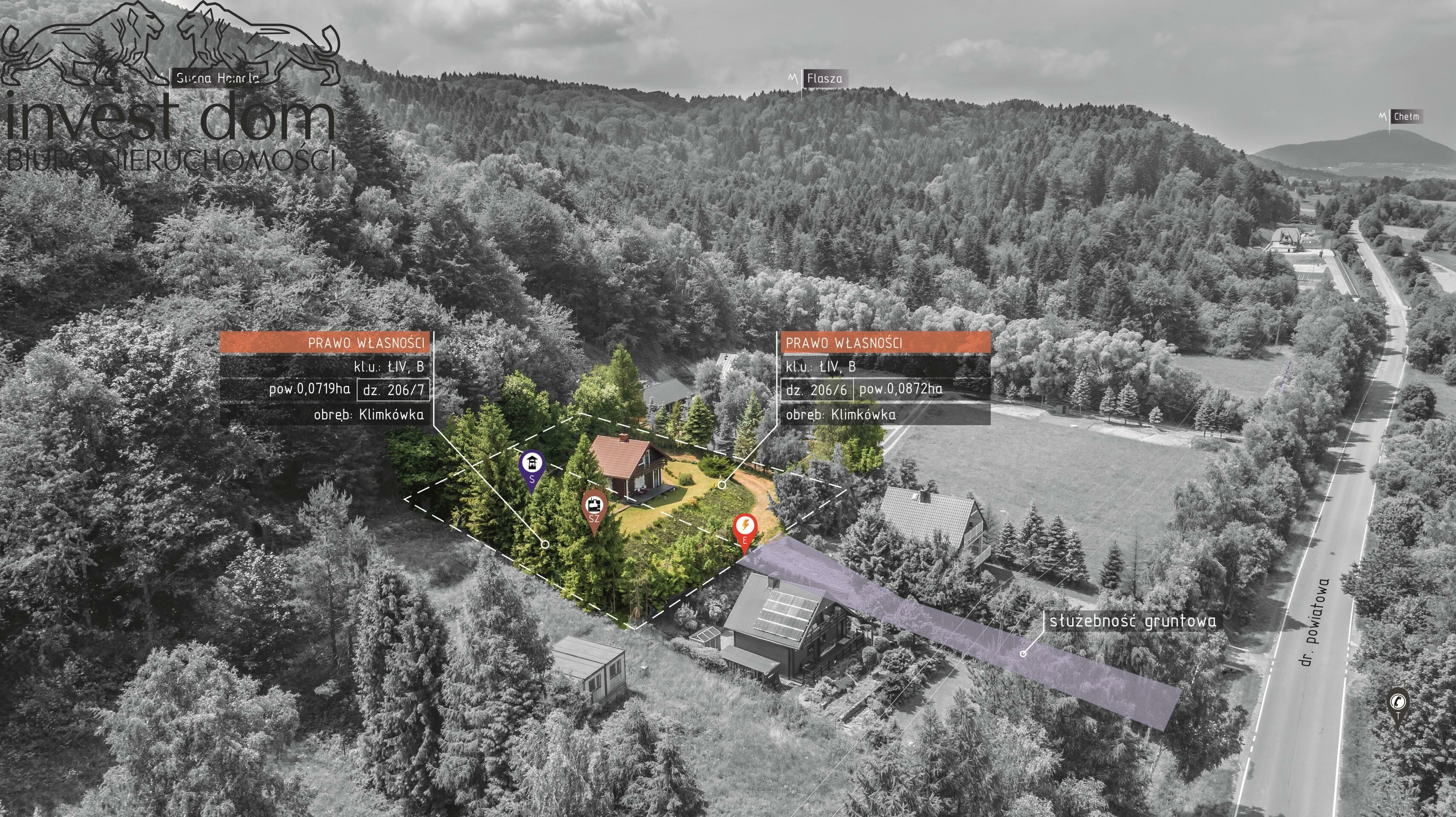 Przedmiotem sprzedaży jest całe prawo własności do nieruchomości gruntowej zabudowanej drewnianym budynkiem mieszkalnym (rekreacyjnym), jednokondygnacyjnym z poddaszem użytkowym o powierzchni użytkowej ok. 53 m.kw. Powyższy budynek stanowi części składowe działki ewidencyjnej o numerze 206/6 oraz 206/7 o łącznej powierzchni: 0,1591 ha, której obszar zgodnie ze studium (MPZP) Miejscowego Planu Zagospodarowania Przestrzennego występują tereny symbolu: 2.3MN/ZR - (tereny zabudowy mieszkaniowo rekreacyjnej) zlokalizowane na zboczy góry "Sucha Homola" w bliskim sąsiedztwie zalewu Klimkówka, w miejscowości Klimkówka, gmina: Ropa, pow. gorlicki, woj. małopolskie.