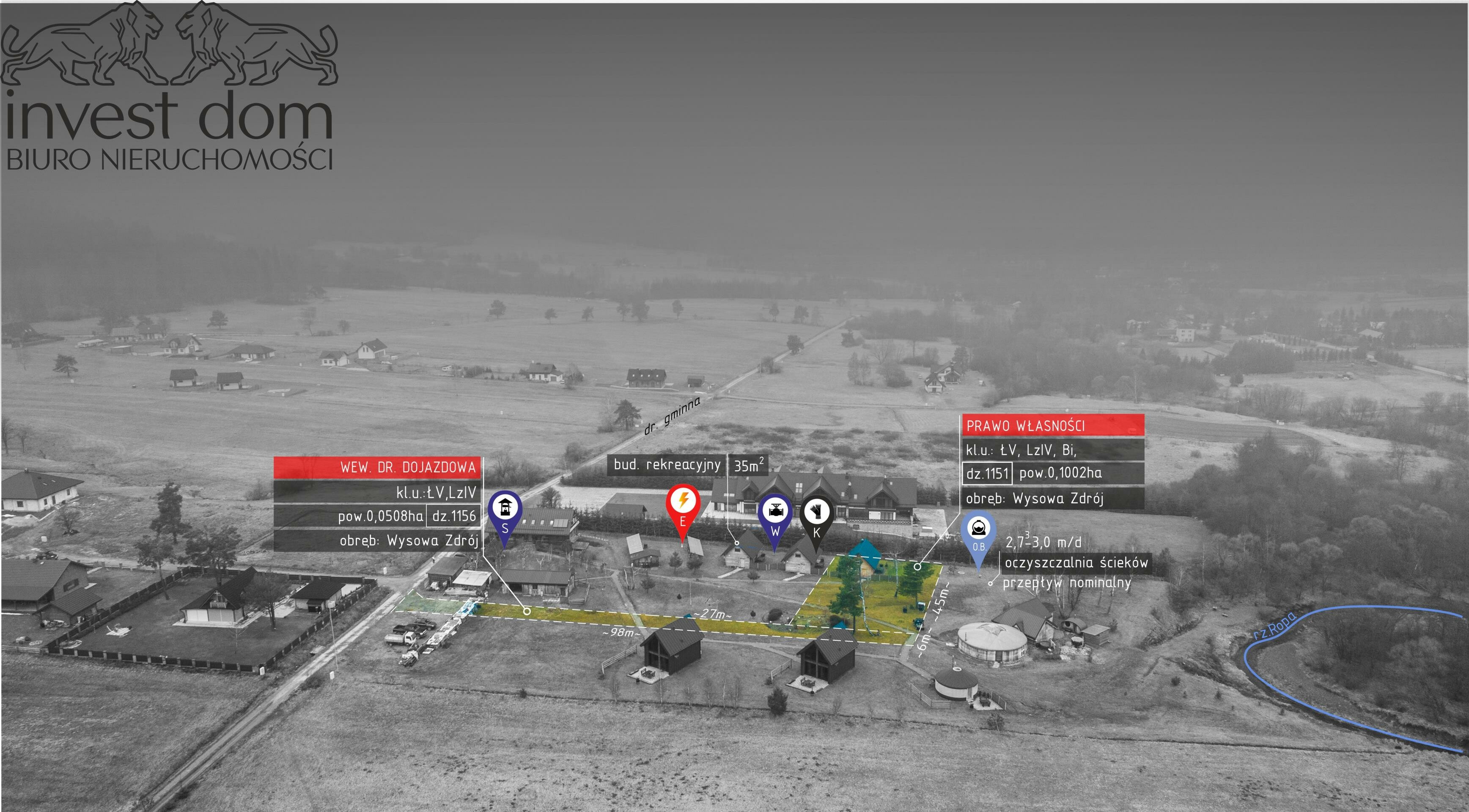 Przedmiotem sprzedaży jest całe prawo własności do nieruchomości gruntowej zabudowanej budynkiem rekreacyjnym, 1-kondygnacyjnym z poddaszem użytkowym gotowym do zamieszkania o powierzchni użytkowej: 35 m.kw. (p.u. kwalifikowana: ok. 45 m.kw.). Opisana powyżej zabudowa stanowi część składową działki ewidencyjnej o numerze: 1151 mierzącej: 0,1002 ha, oraz udział do wew. dr. dojazdowej - w celu zapewnienia dojazdu, oznaczony jako działka ewidencyjna o numerze: 1156 o powierzchni: 0,0508 ha. Obszar tych działek zgodnie z (MPZP) Miejscowym Planem Zagospodarowania Przestrzennego znajduje się w terenach symbolu: MNL - (tereny zabudowy mieszkaniowej jednorodzinnej i rekreacyjnej). Posesja usytuowana w sąsiedztwie granicy polsko-słowackiej, w zacisznym zakątku uzdrowiskowej miejscowości Wysowa-Zdrój, na terenie powiatu gorlickiego w województwie małopolskim, nieruchomość ta oferuje wyjątkowe połączenie spokoju, natury i prestiżowej lokalizacji.