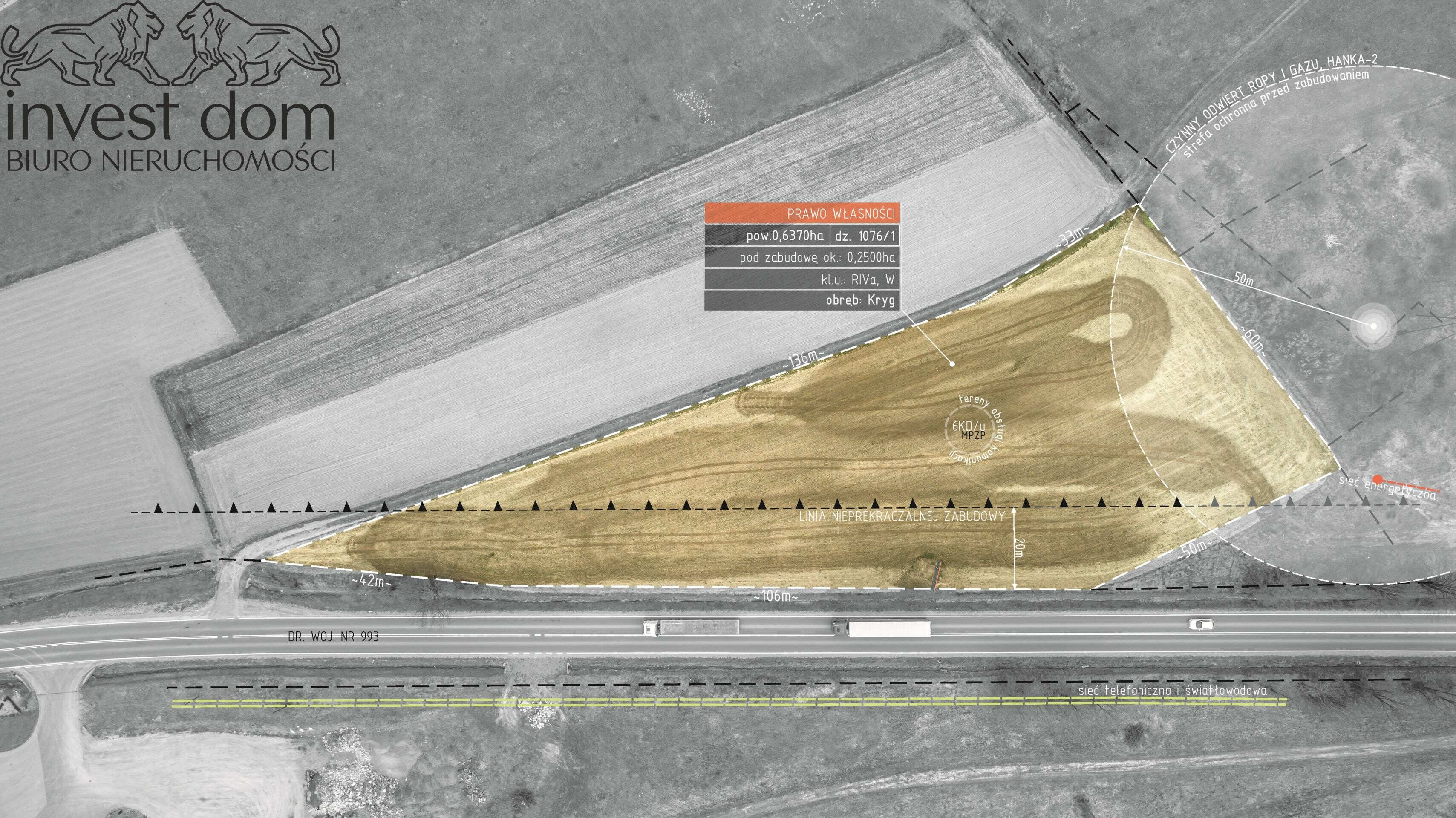 Przedmiotem sprzedaży jest atrakcyjna nieruchomość gruntowa niezabudowana o powierzchni 0,6370 ha, stanowiąca pełną własność. Działka oznaczona numerem ewidencyjnym: 1076/1 objęta jest Miejscowym Planem Zagospodarowania Przestrzennego i znajduje się w obszarze oznaczonym symbolem 6KD/U tereny obsługi komunikacji.