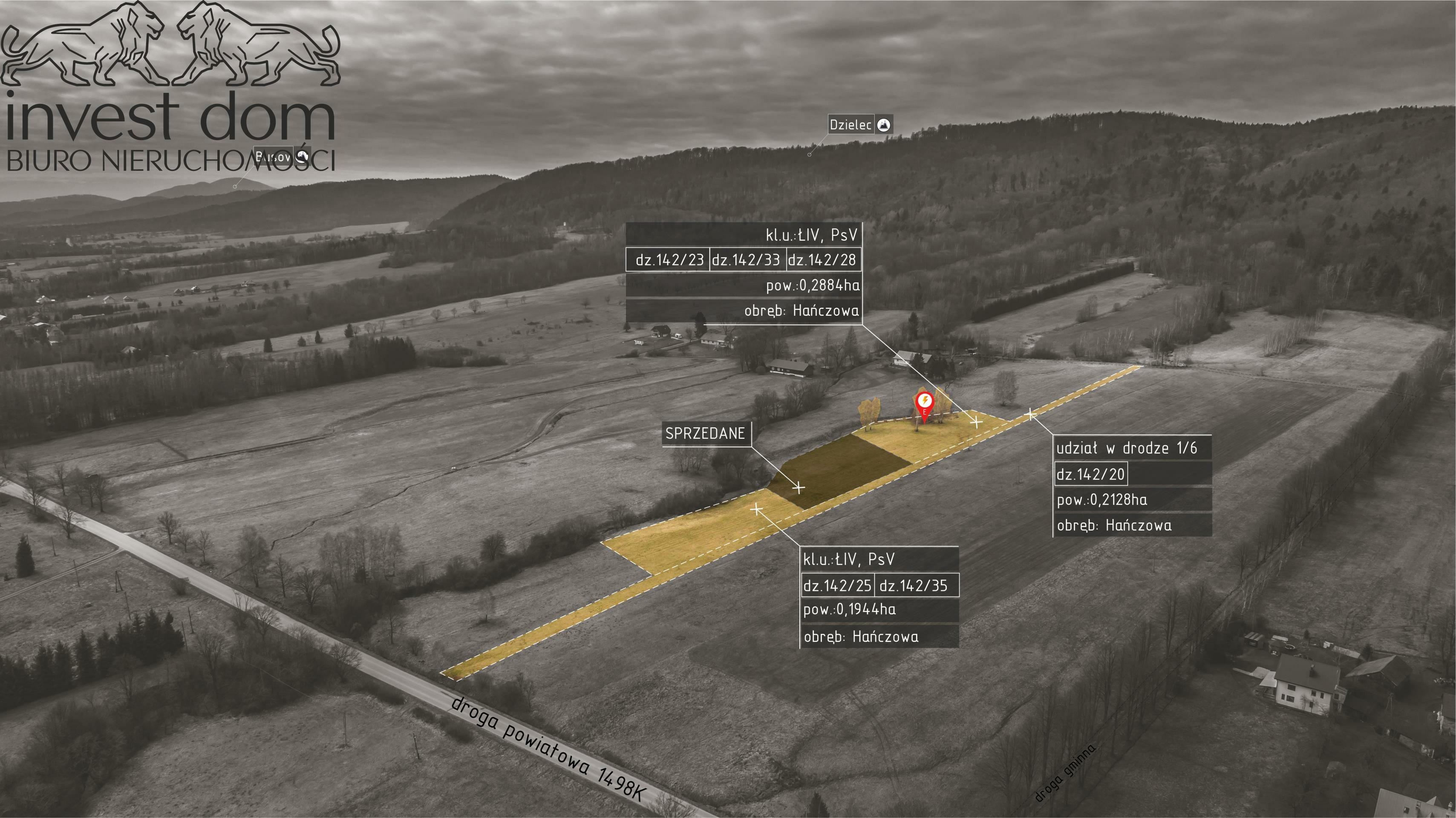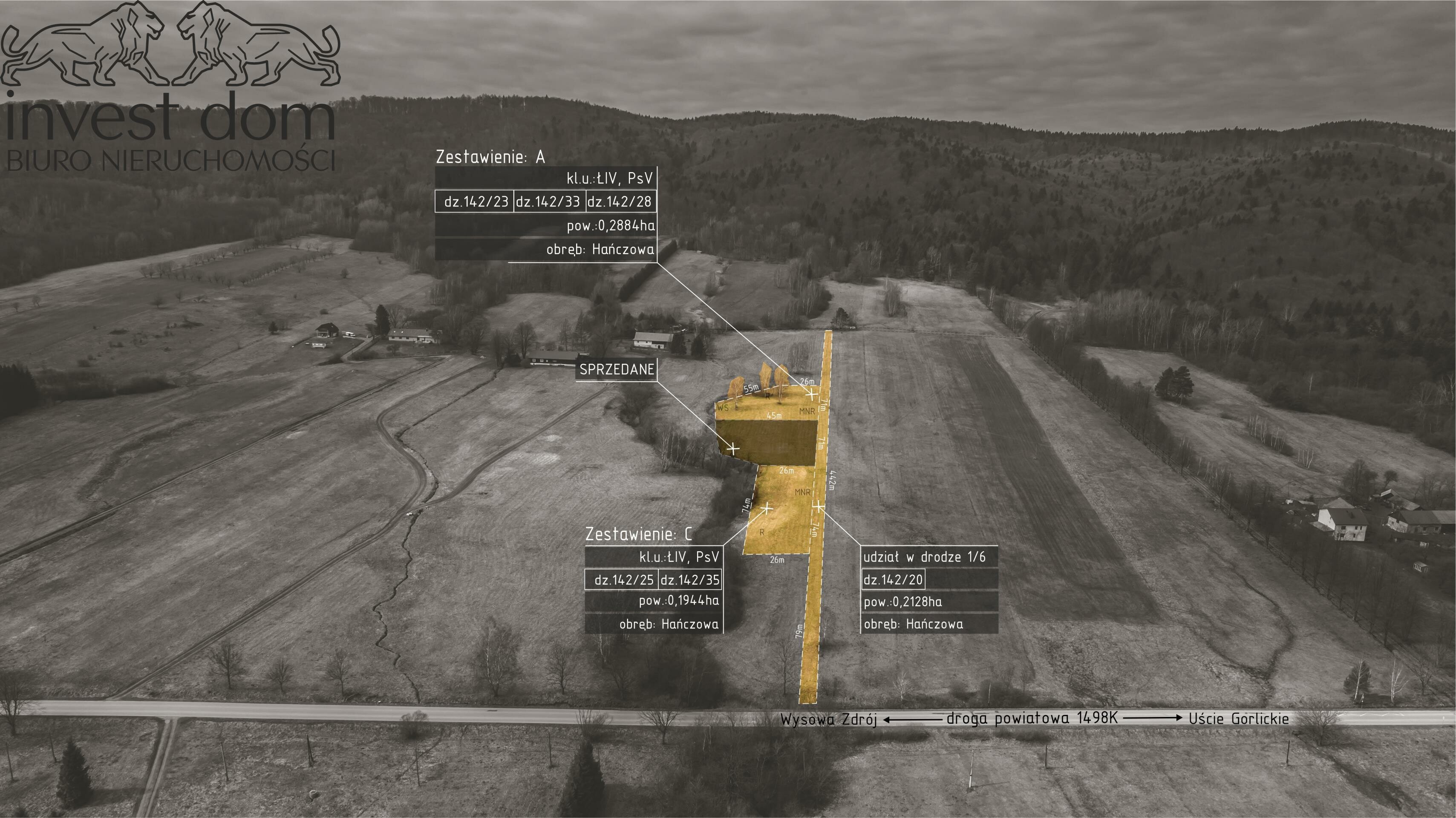 które docelowo zostały utworzone w wyniku podziału macierzystej działki ewidencyjnej numer: 142/4, 143/7, 142/14, 142/18. Obszar nieruchomości zgodnie z  (MPZP) Miejscowym Planem Zagospodarowania Przestrzennego obszar wszystkich działek znajduje się w terenach oznaczonych symbolem: MNR - (tereny zabudowy zagrodowej, mieszkaniowej jednorodzinnej i usługowej), MNU - (tereny zabudowy mieszkaniowej jednorodzinnej i usługowej), R - (tereny rolne) stanowiące klaso-użytki: (ŁIV, PsV). Oferowana nieruchomość jest zlokalizowana w sąsiedztwie pobliskiego strumienia, łąk oraz lasów w charyzmatycznej miejscowości umajonej kwiecistymi ziołami wśród lokalnych ciągów ekologicznych Beskidu Niskiego znana jako sołectwo Hańczowa w pow. gorlickim, jedn. ewid.: Uście Gorlickie. woj. małopolskie.
