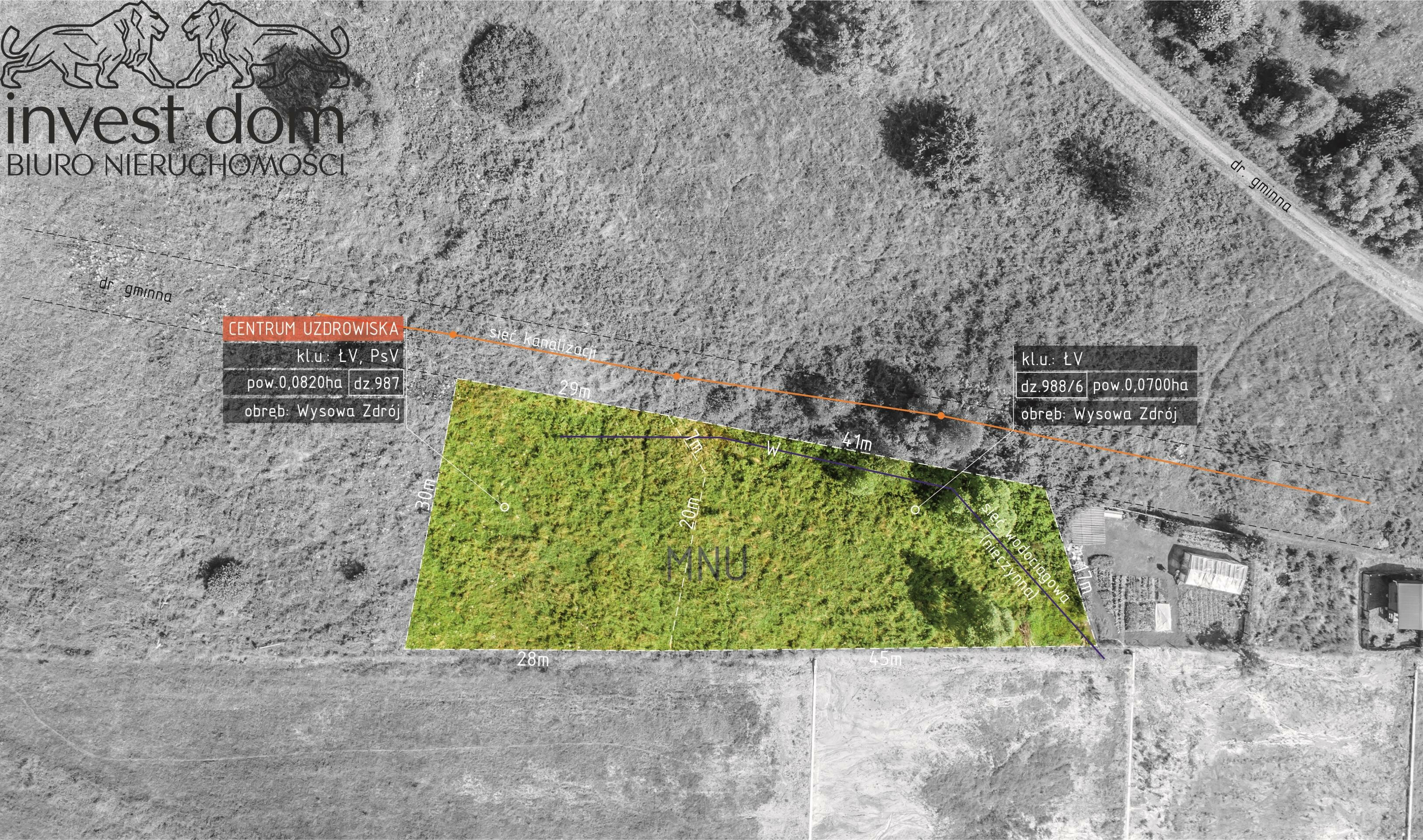 Przedmiotem sprzedaży jest kompleks dwóch (2) działek niezabudowanych z przeznaczeniem budowlanym, oznaczonych numerem ewidencyjnym: dz. 987 o powierzchni 0,0820 ha oraz dz. 988/6 o powierzchni 0,0700 ha, które zgodnie z (MPZP) Miejscowym Planie Zagospodarowania Przestrzennego znajdują się w terenach symbolu: MNU - (tereny zabudowy mieszkaniowej jednorodzinnej i usługowej). Całość terenu stanowią klaso-użytki: RV, PsV, zlokalizowane w urokliwym Beskidzie Niskim w centrum najpiękniejszego uzdrowiska w Polsce Wysowa-Zdrój, pow. gorlicki, woj. małopolskie.