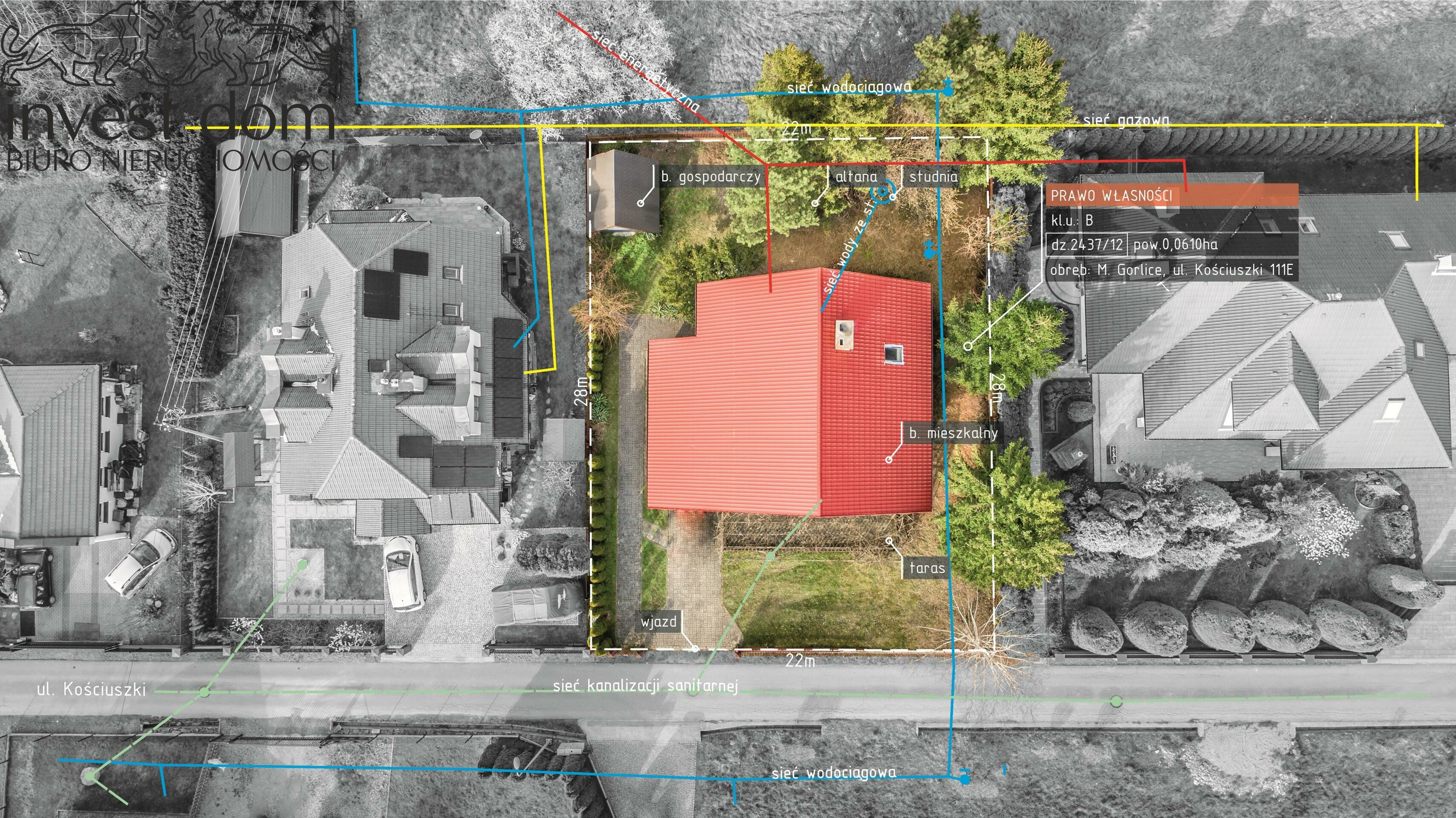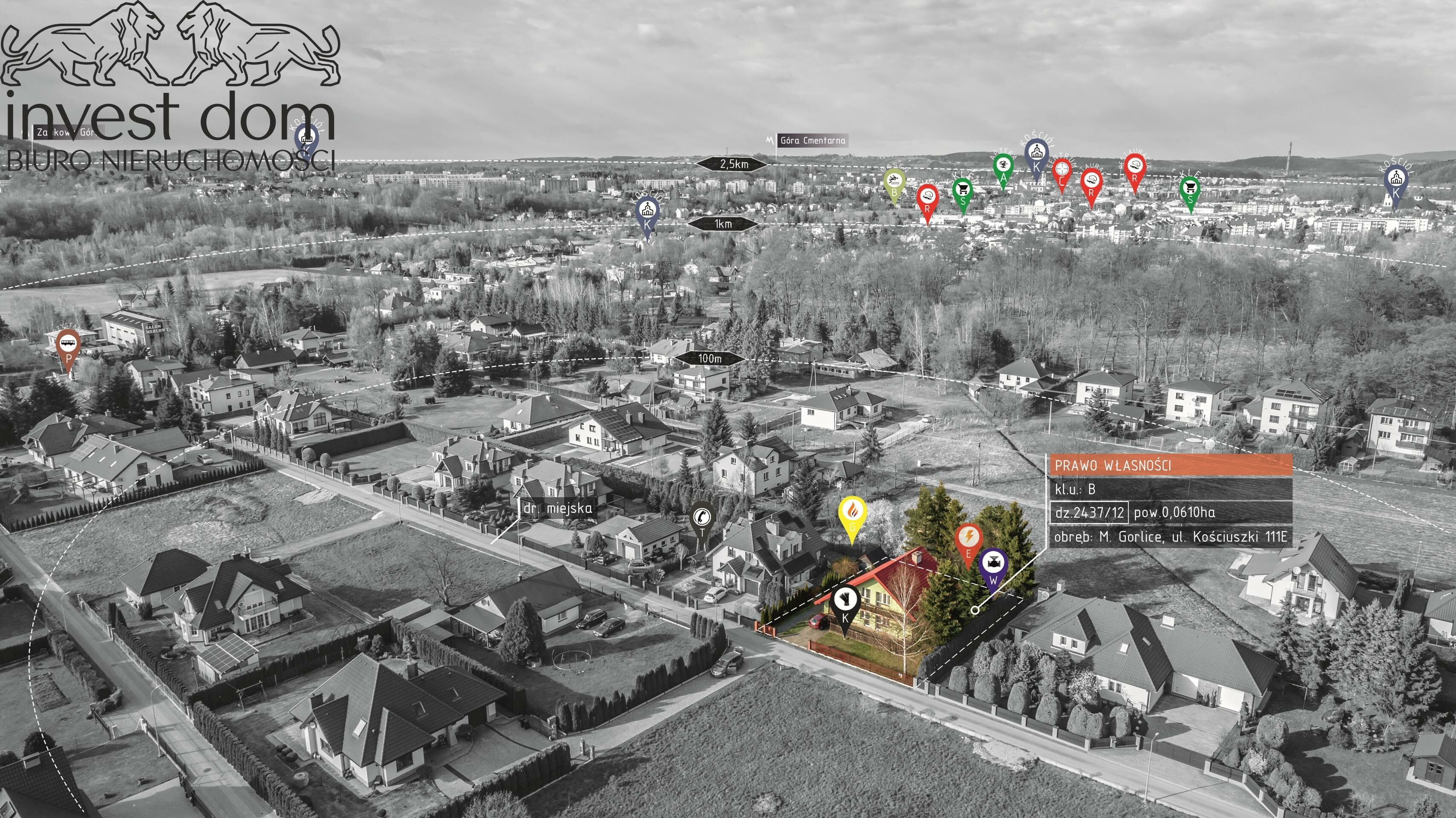 Przedmiotem sprzedaży jest całe prawo własności do nieruchomości gruntowej zabudowanej (1) kondygnacyjnym budynkiem mieszkalnym jednorodzinnym z poddaszem użytkowym, bez podpiwniczenia o łącznej powierzchni użytkowej: 135 m2 stanowiąc część składową działki ewidencyjnej o numerze: 2437/12 powierzchni: 0,0610 ha. Zgodnie z (MPZP) Miejscowym Planem Zagospodarowania Przestrzennego przedmiotowa nieruchomość obejmuje tereny oznaczone symbolem: 111.MN - (tereny jednorodzinnego budownictwa mieszkaniowego). Posesja zlokalizowana w urokliwym zakątku miasta w sąsiedztwie dworkowych domów jednorodzinnych w Gorlicach, powiat gorlicki, woj. małopolskie.