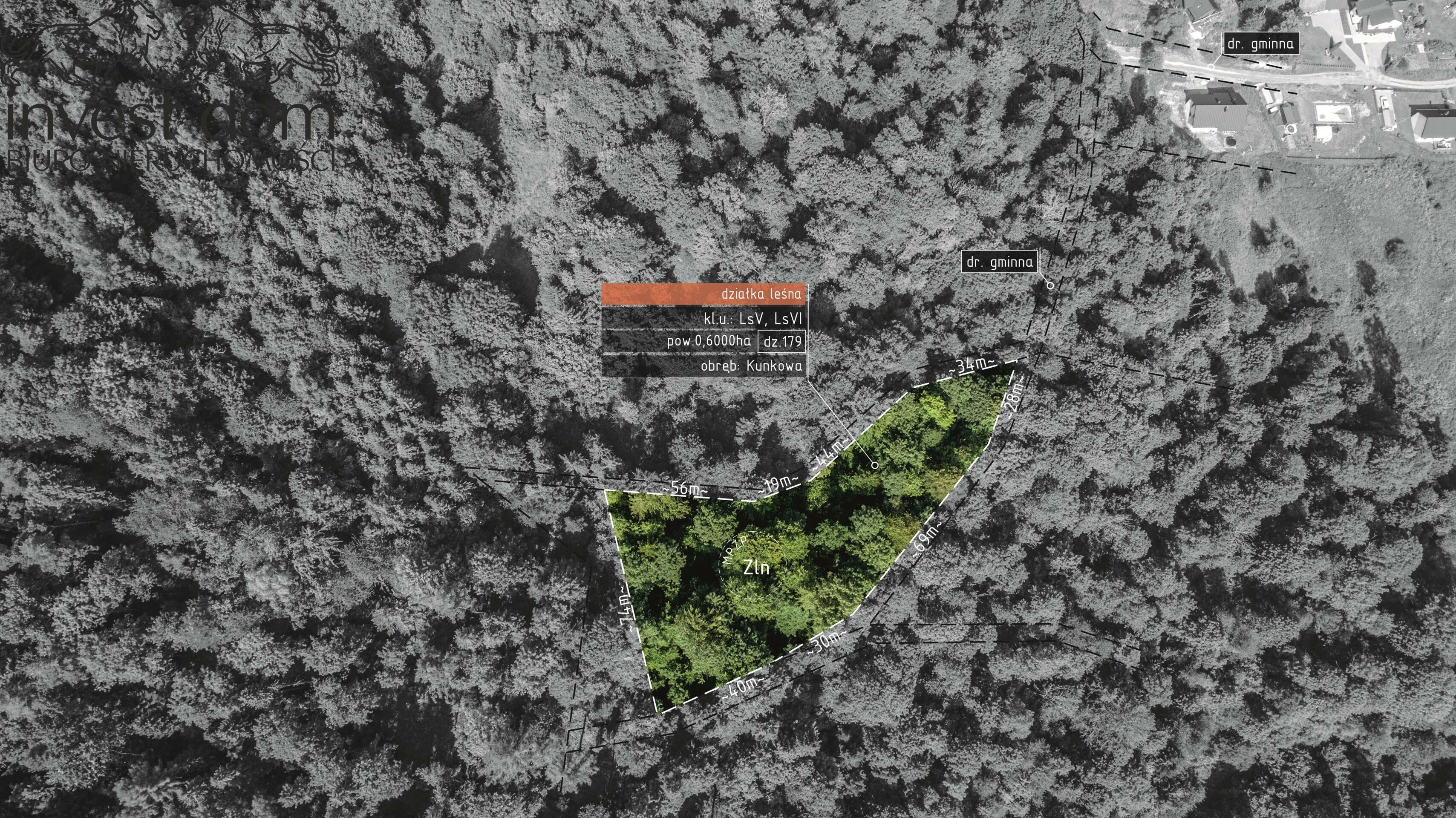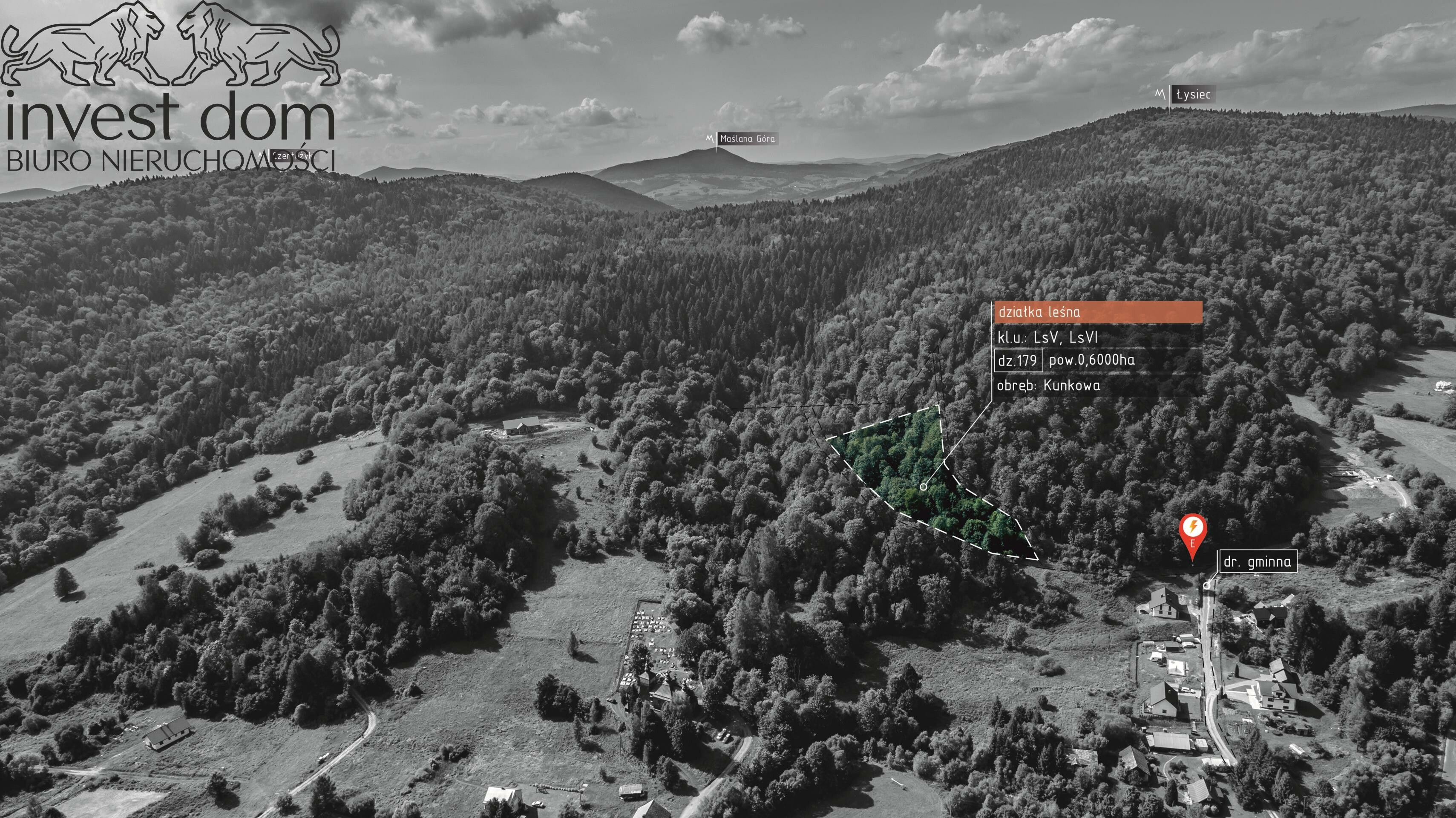 Przedmiotem sprzedaży jest całe prawo własności działki leśnej powierzchni: 0,6000 ha o numerze ewidencyjnym: 179, która zgodnie z Miejscowym Planem Zagospodarowania Przestrzennego (MPZP) znajduje się w terenach oznaczonych symbolem: ZLn - (tereny leśne niepaństwowe). Przedmiotowy obszar gruntu w całości stanowi klaso-użytki: (LsV, LsVI) zlokalizowany w malowniczych górskich lasach Beskidu Niskiego w sołectwie Kunkowa, jednostka ewidencyjna: Uście Gorlickie, pow. gorlicki, woj. małopolskie.