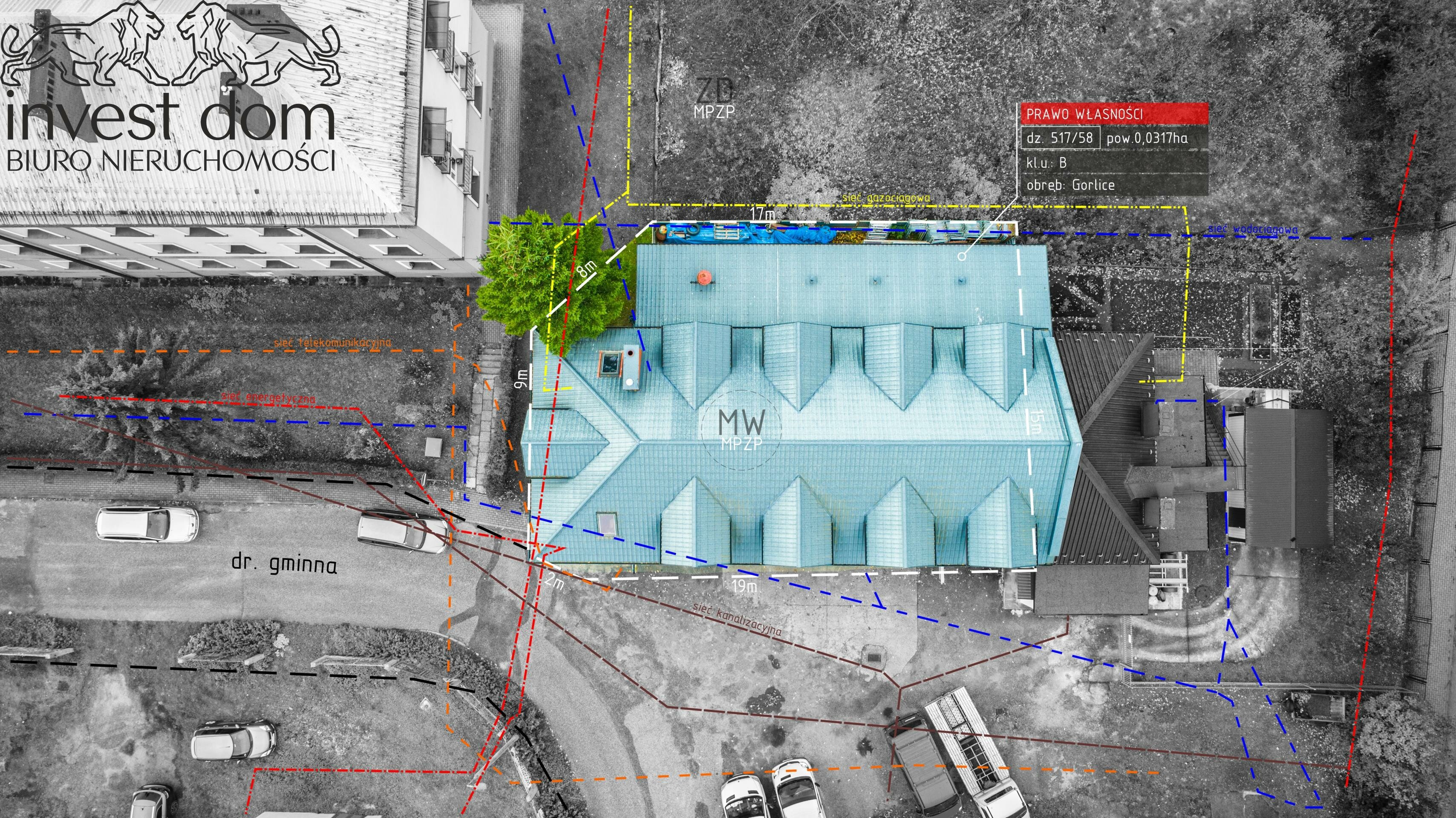 Przedmiotem sprzedaży jest prawo własności budynku posadowionego na nieruchomości gruntowej oddanej w użytkowanie wieczyste oznaczonej jako działka ewidencyjna numer: 517/58 o powierzchni: 0,0317 ha zabudowanej obiektem budowlanym typu biurowo-warsztatowego. Obiekt wybudowany początkiem lat 2000, po kapitalnym remoncie w 2007 r., wolnostojący, (I-kondygnacyjny) z poddaszem użytkowym, niepodpiwniczony o łącznej powierzchni użytkowej wynoszącej: ok. 378 m.kw.. Zgodnie z (MPZP) Miejscowym Planem Zagospodarowania Przestrzennego przeznaczenie pod zabudowę obejmuje tereny symbolu: 10.MW - (teren komunalnego budownictwa mieszkaniowego). Nieruchomość umiejscowiona w przemysłowej dzielnicy Gorlic przy ulicy ks. Piotra Ściegiennego, nieopodal ścisłego centrum miasta w powiecie gorlickim, województwie małopolskim.