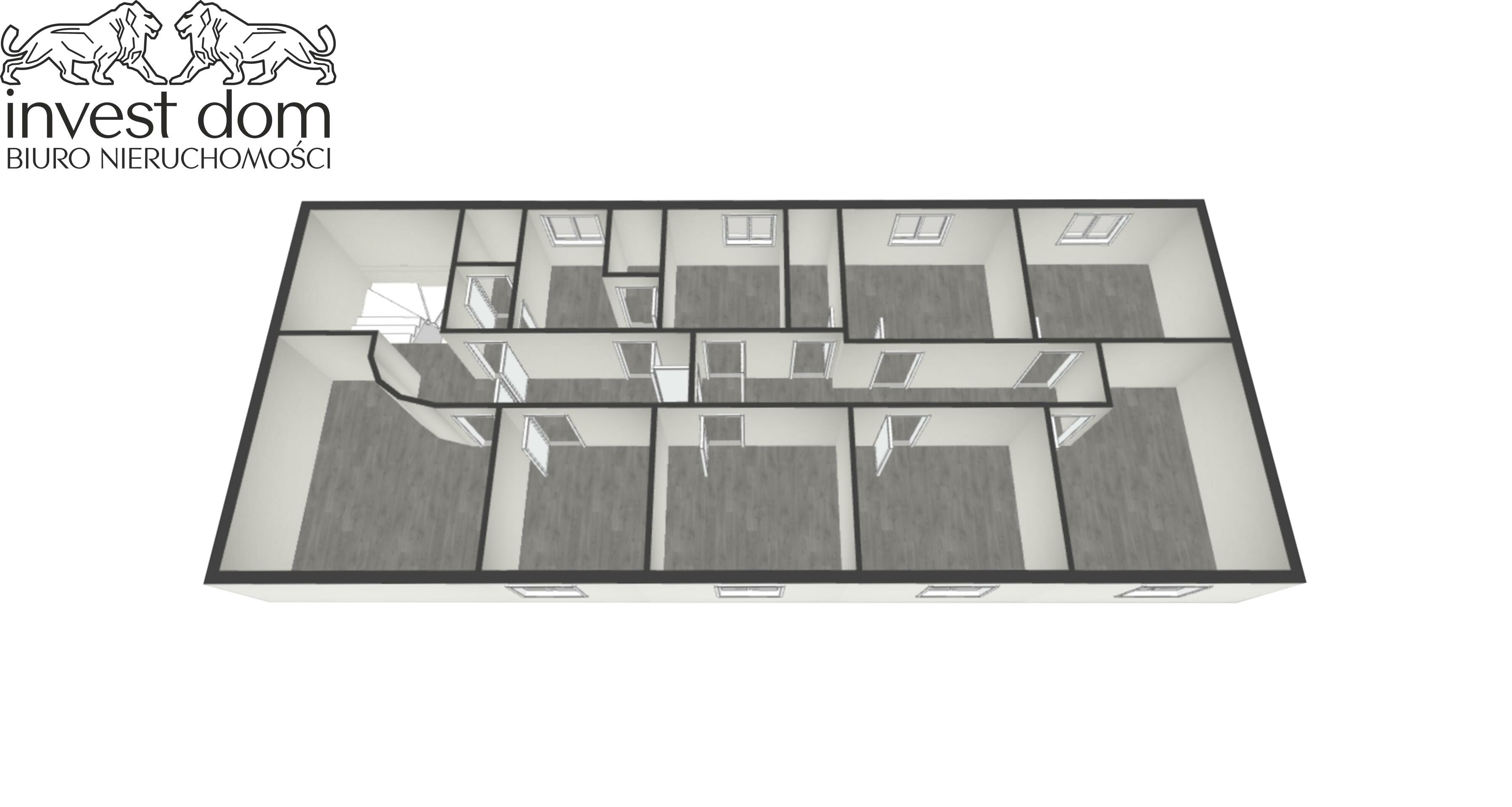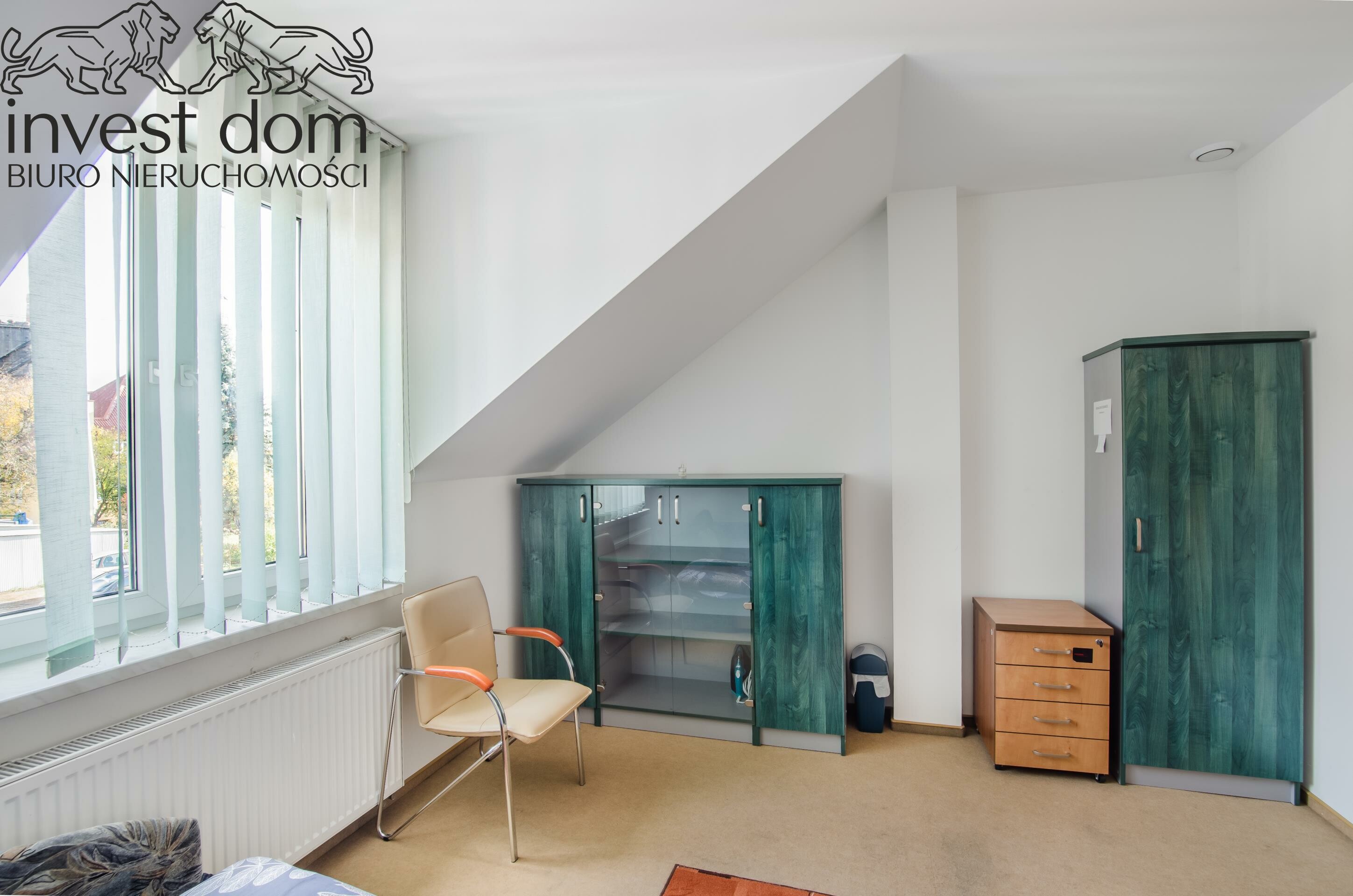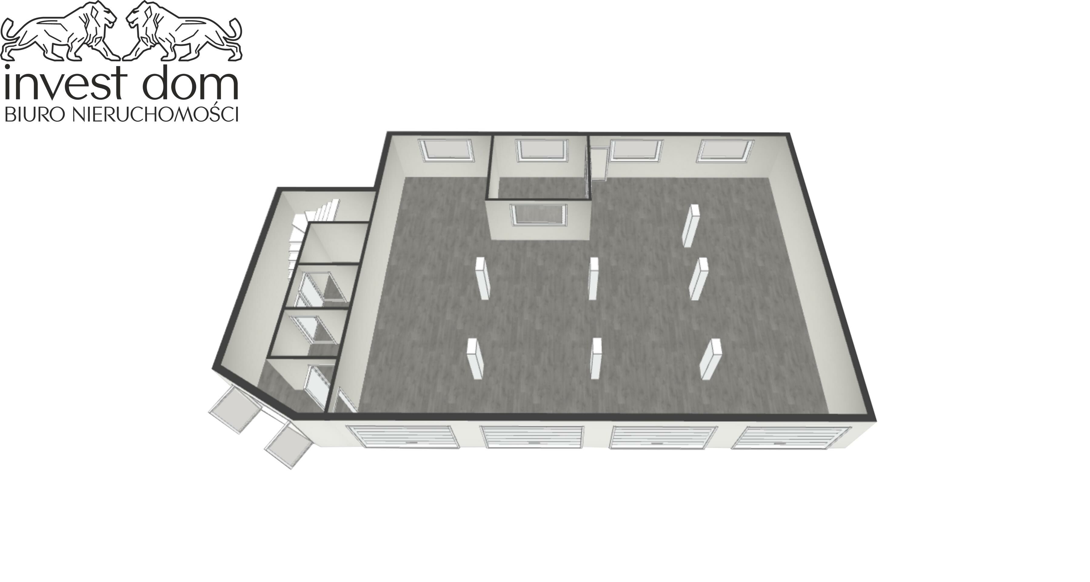 PODDASZE: 6 pomieszczeń biurowych, schowek, korytarz, toaleta + prysznic, pralnia, pomieszczenie sklepowe/magazyn.